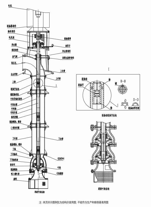 本泵是以中心旋转体和泵体两部分组成。其中旋转体部分是由叶轮、轴、套筒式刚性联轴器(联轴节和联轴套)、轴承、弹性柱销联轴器等组成。泵体部分的由滤网、空间导叶、外管、内管、橡胶轴承架、底座、出水弯管、轴承体、电机座等构成。